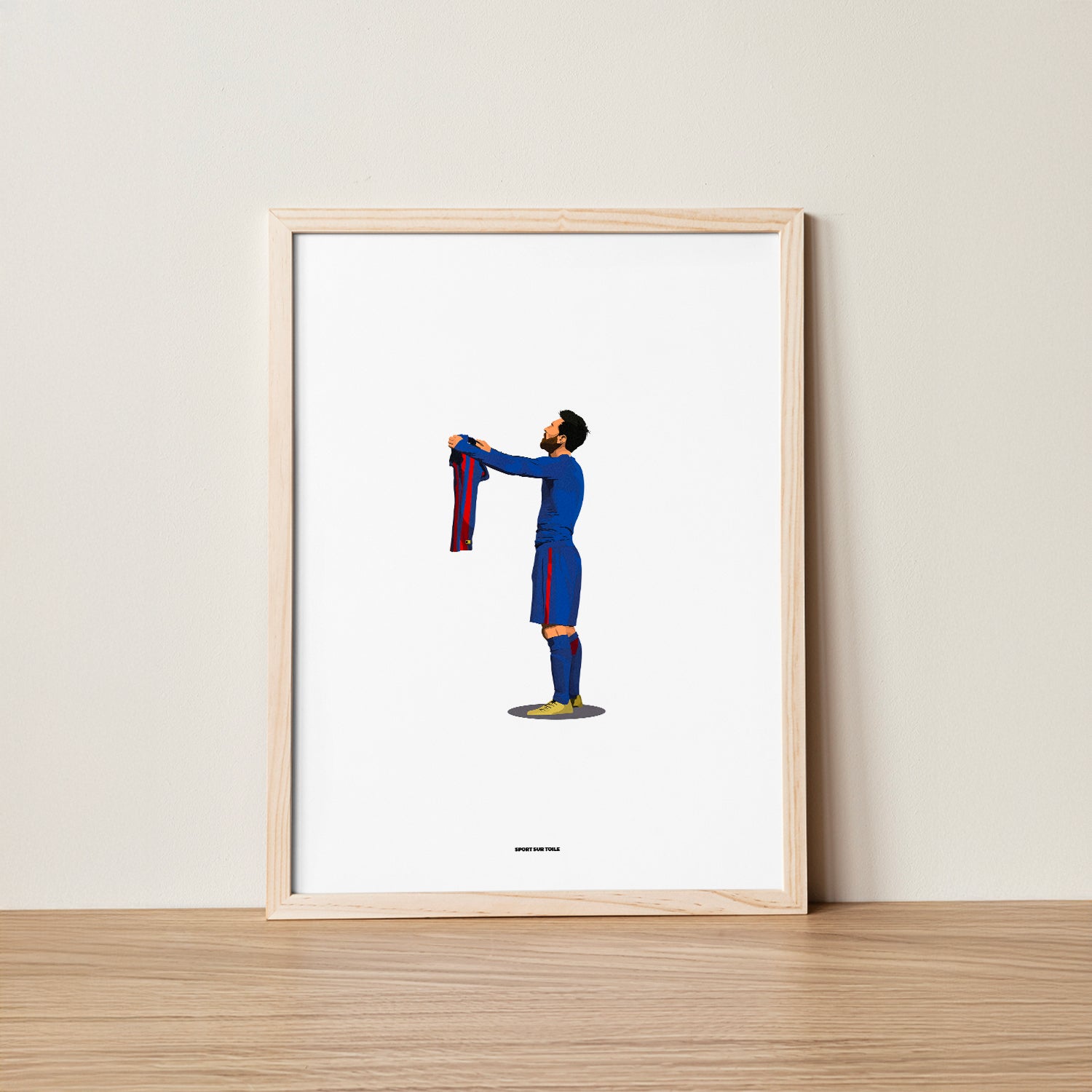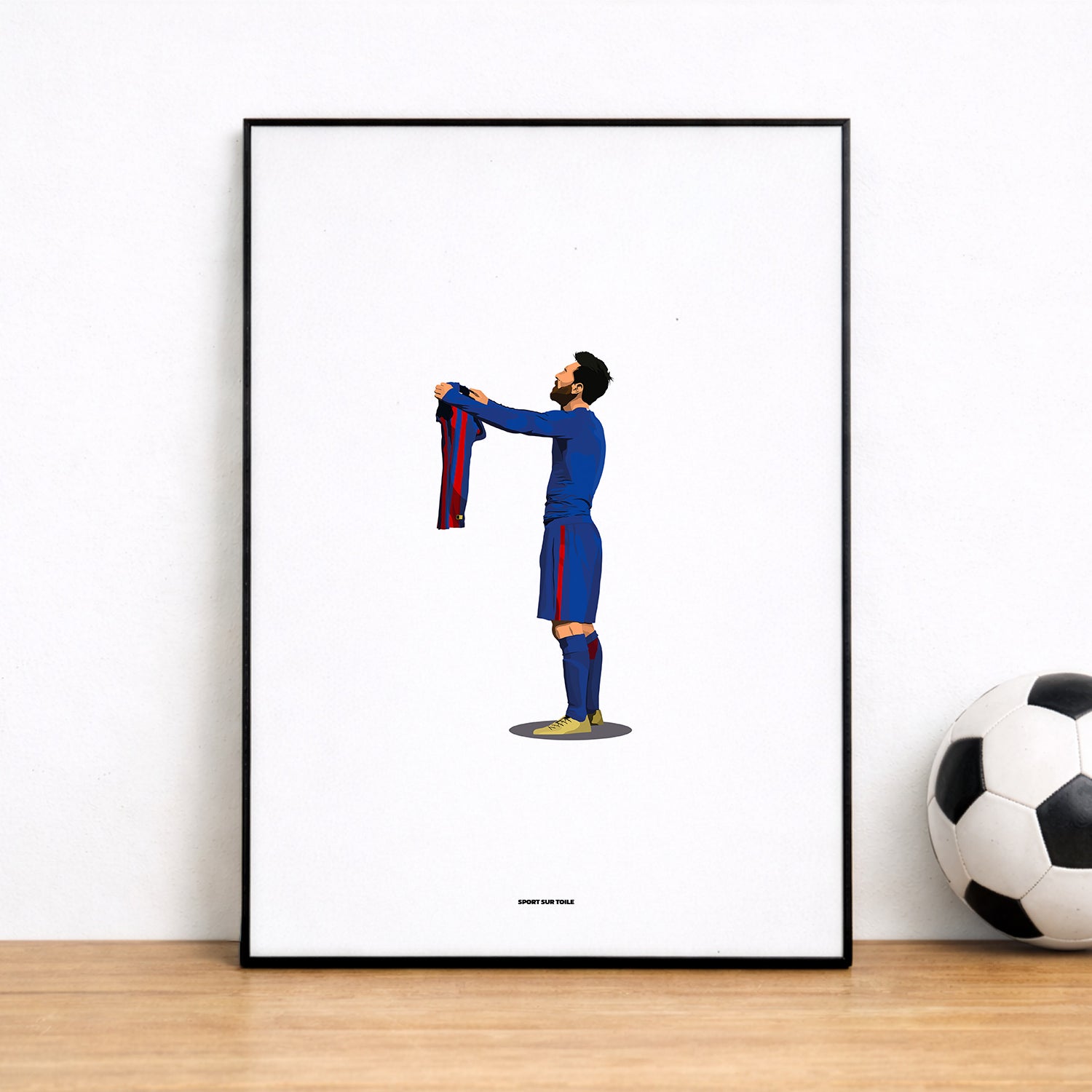 Cette affiche football rend hommage à un moment devenu mythique : le 23 avril 2017, lors du Clasico au stade Santiago Bernabéu, quand Lionel Messi brandit son maillot face aux supporters madrilènes après son but décisif dans les dernières secondes. Une scène entrée dans l’histoire du football européen.