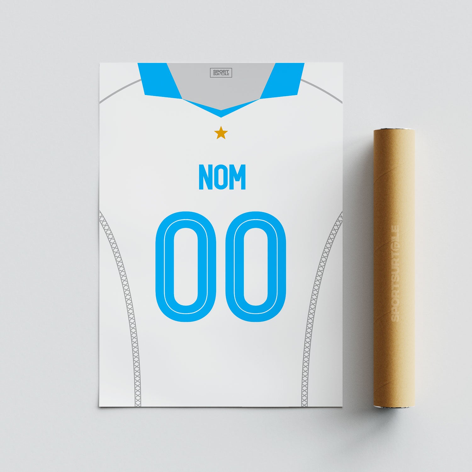 Cette affiche du maillot domicile de l’Olympique de Marseille est entièrement personnalisable avec le nom et le numéro de votre choix.
