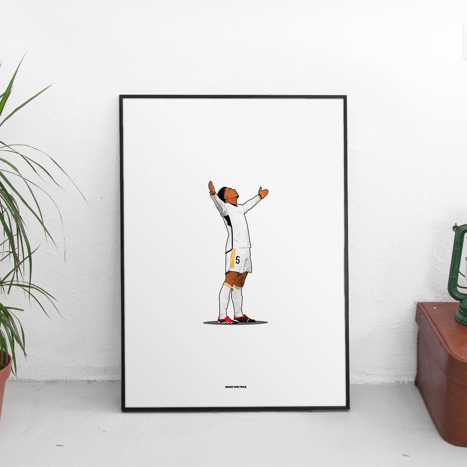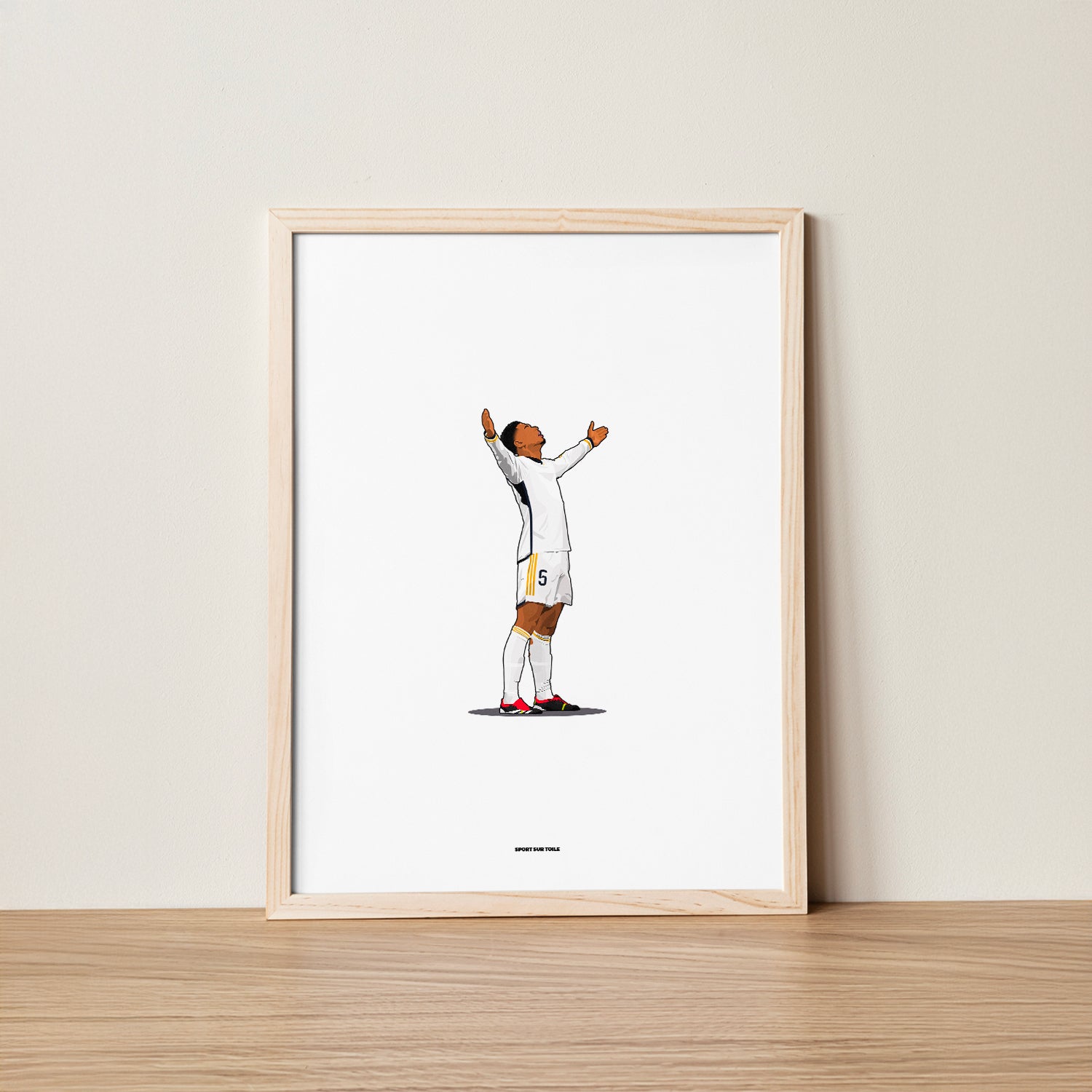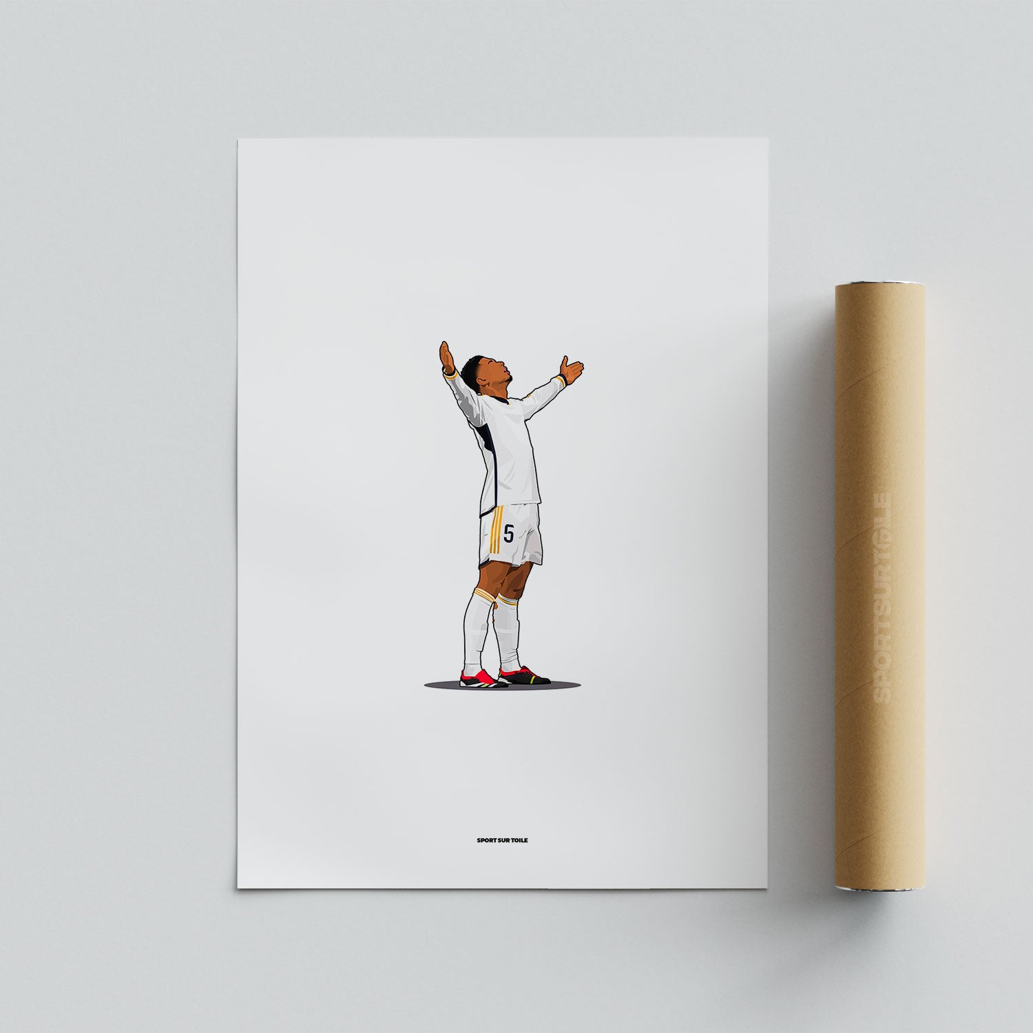 Cette affiche football met à l’honneur la célébration iconique de Jude Bellingham, bras ouverts face au public après son but. Une image forte qui représente la confiance et l’énergie des grands moments.